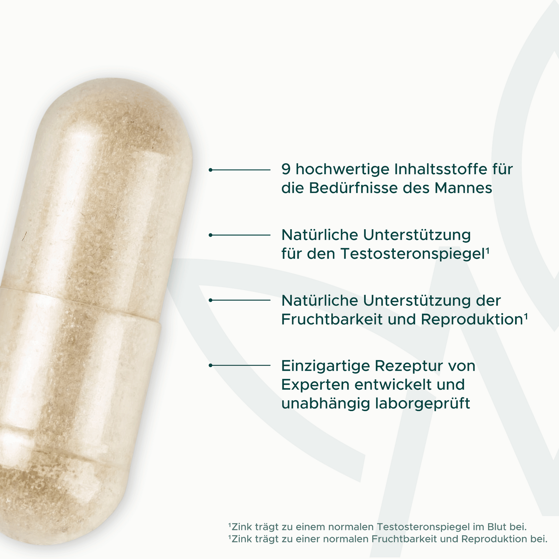 Als Nahrungsergänzungsmittel unterliegen unsere Produkte strengen gesetzlichen Regelungen. Diese untersagen es uns, zu bestimmten Inhaltsstoffen spezifische Wirkaussagen zu treffen. Deshalb beschränken wir uns auf wissenschaftlich belegte und gesetzlich zulässige Aussagen (Health Claims) wie beispielsweise den Beitrag zu einem normalen Testosteronspiegel¹. Für detaillierte Informationen zur individuellen Wirkung empfehlen wir ein persönliches Gespräch mit Ihrem Arzt.
