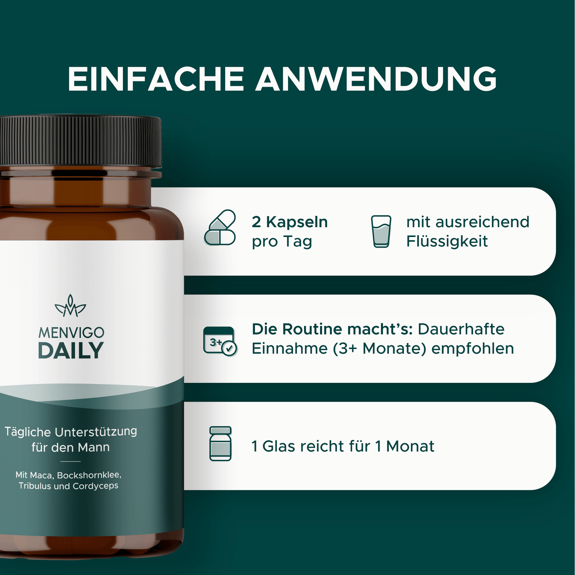 Ja, Menvigo Daily ist für Männer aller Altersgruppen geeignet. Besonders Männer ab 45 können von den unterstützenden Eigenschaften profitieren.