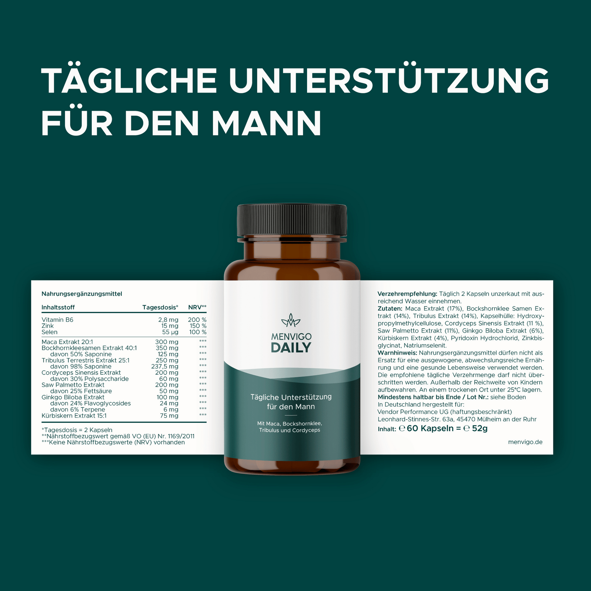 Menvigo Daily wurde von Experten entwickelt, um die spezifischen Bedürfnisse des männlichen Körpers gezielt zu unterstützen.Unser einzigartiger Wirkstoffkomplex kombiniert modernste Wissenschaft mit hochwertigen Inhaltsstoffen, die seit Jahrhunderten genutzt werden. Sie wurden sorgfältig ausgewählt und in ihrer Dosierung optimal aufeinander abgestimmt, um zu einem normalen Testosteronspiegel beizutragen¹ und die männliche Vitalität auf natürliche Weise zu unterstützen.